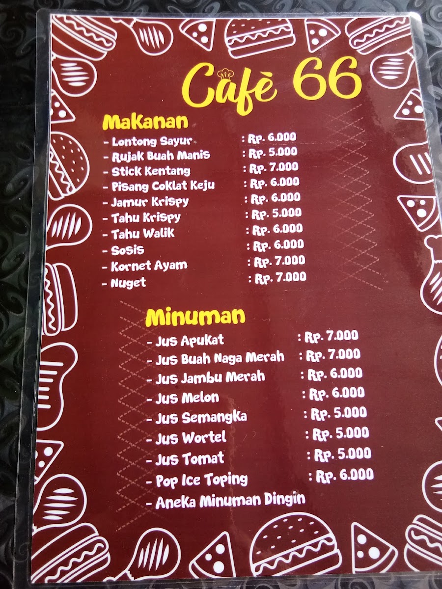 Welcome to Cafe 66 'Juice & Coffee', an inviting haven located at Jl. Komisaris Besar Polisi Moh. Duryat No.66 in beautiful Lamongan, Indonesia. This cafe is more than just a place to sip your favorite beverages; it's a community hub. With a warm and friendly atmosphere, it’s perfect for unwinding with friends or catching up on work, thanks to complimentary Wi-Fi.